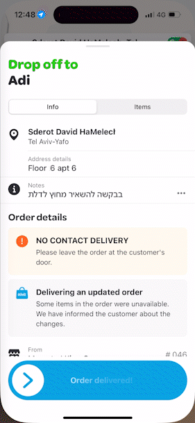 אם לא יוצע לנו משלוח נוסף, תחל מסימת המסירה (המערכת מתעדפת לבד איזה משלוח צריך למסור קודם). לאחר המסירה שלו, ייתכן ותוצע לנו משימה נוספת על הדרך או שתחל מסירת המשלוח הנוסף.