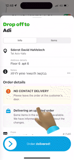 שימו לב 💙 - במידה וישנו איחור של יותר מ 10 דק׳ באיסוף (בזמן שיש לנו משלוח בתיק), יש לפנות לצ׳אט התמיכה ולבקש להוריד של המשלוח.